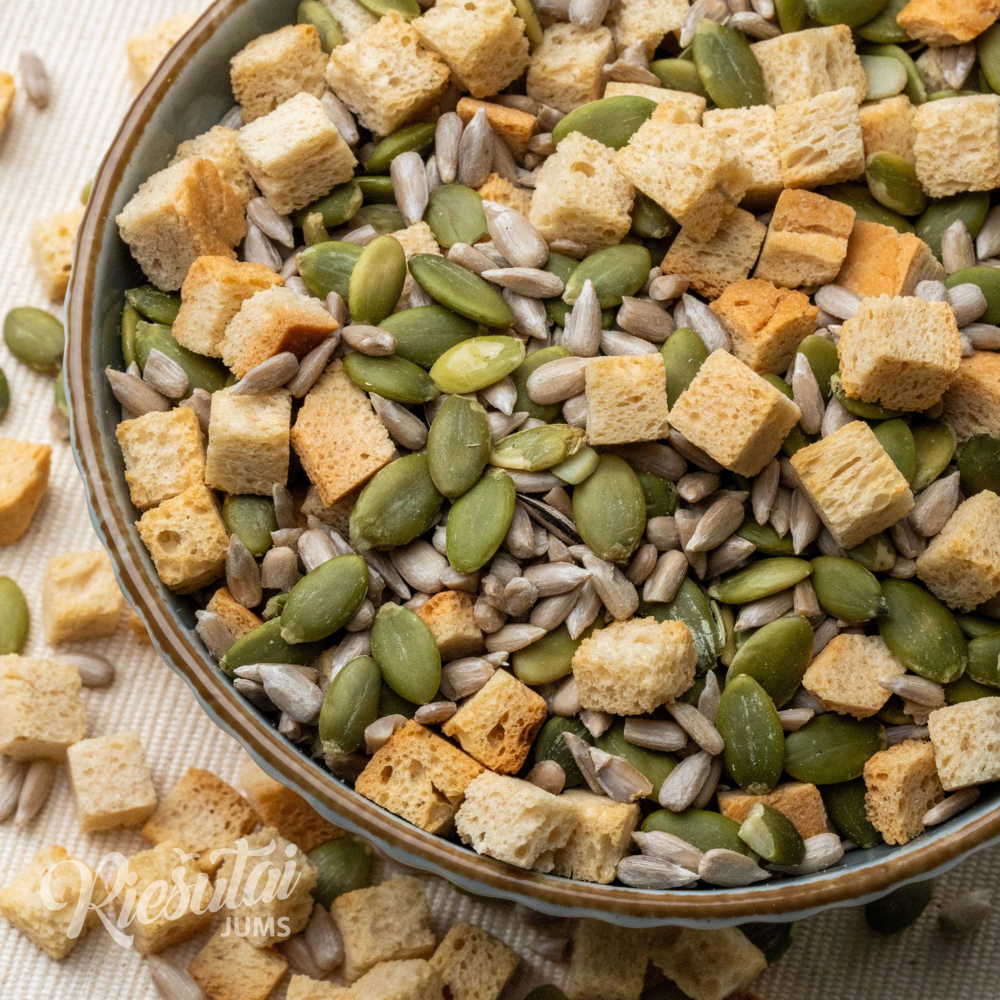 Suteikite savo patiekalams daugiau skonio, tekstūros ir sotumo su šiuo universaliu mišiniu salotoms ir sriuboms. Traškios sėklos ir gardūs skrebučiai puikiai dera tiek su lengvomis daržovių salotomis, tiek su tirštomis kreminėmis sriubomis. Pabarstykite juo moliūgų, pomidorų ar brokolių sriubą – akimirksniu atsiras malonus traškumas. Įmaišykite į šviežias salotas su feta ar kepta vištiena, naudokite kaip priedą prie troškinių ar net užkandžių dubenėlių. Tai praktiškas pasirinkimas kasdieniam maisto ruošimui, kai norisi greitai ir paprastai pagyvinti patiekalą be papildomo pasiruošimo. Vienas šaukštas – ir jūsų lėkštėje jau daugiau skonio, traškumo bei vizualaus patrauklumo.