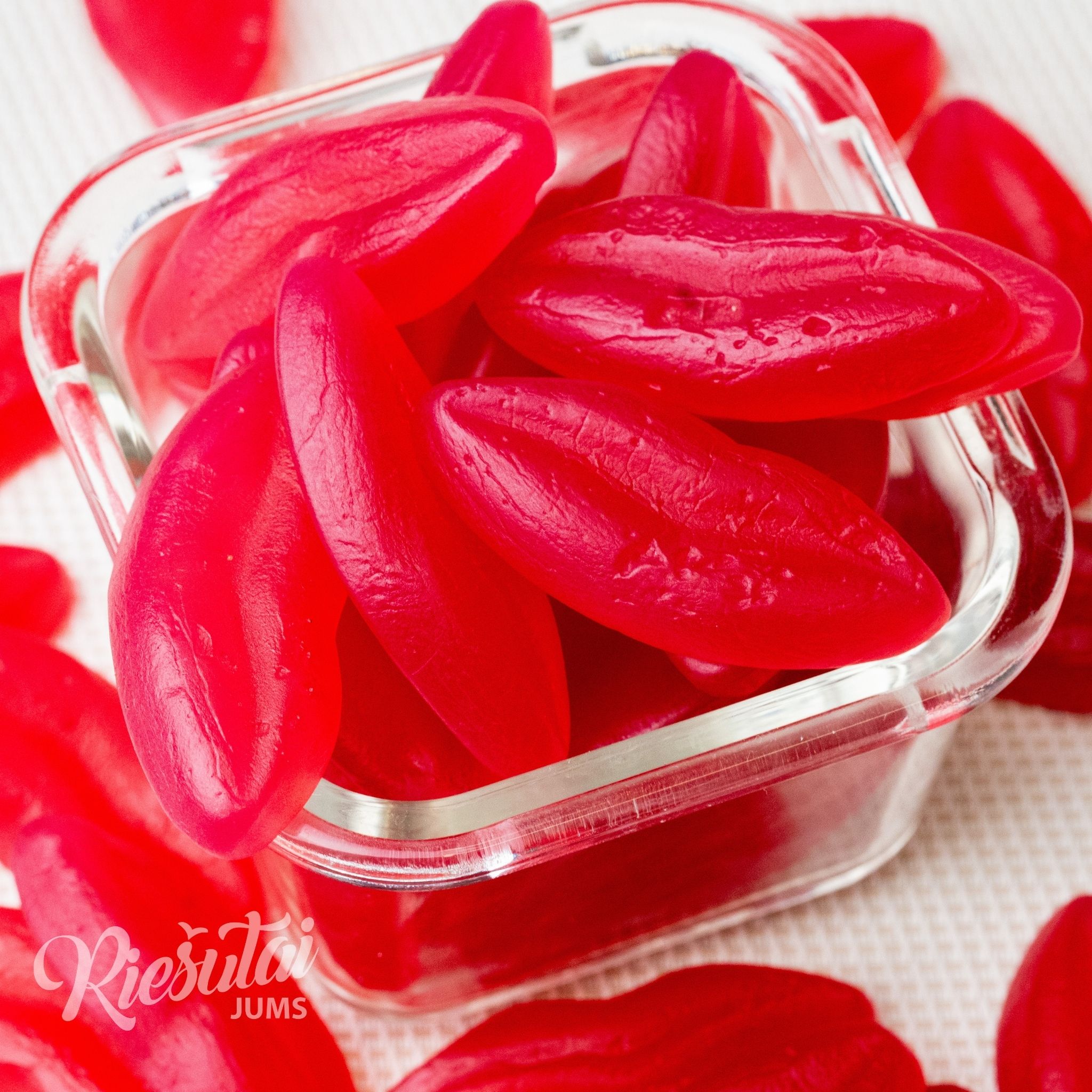 Tarsi saldus bučinys! Šie žaismingos išvaizdos vaisinio skonio guminukai yra tokie žavūs ir skanūs. Be to, juos galima panaudoti įvairių desertų dekoravimui. Ryškiai raudona spalva ir lūpų forma puikiai dera su gardžiu vaisiniu skoniu.